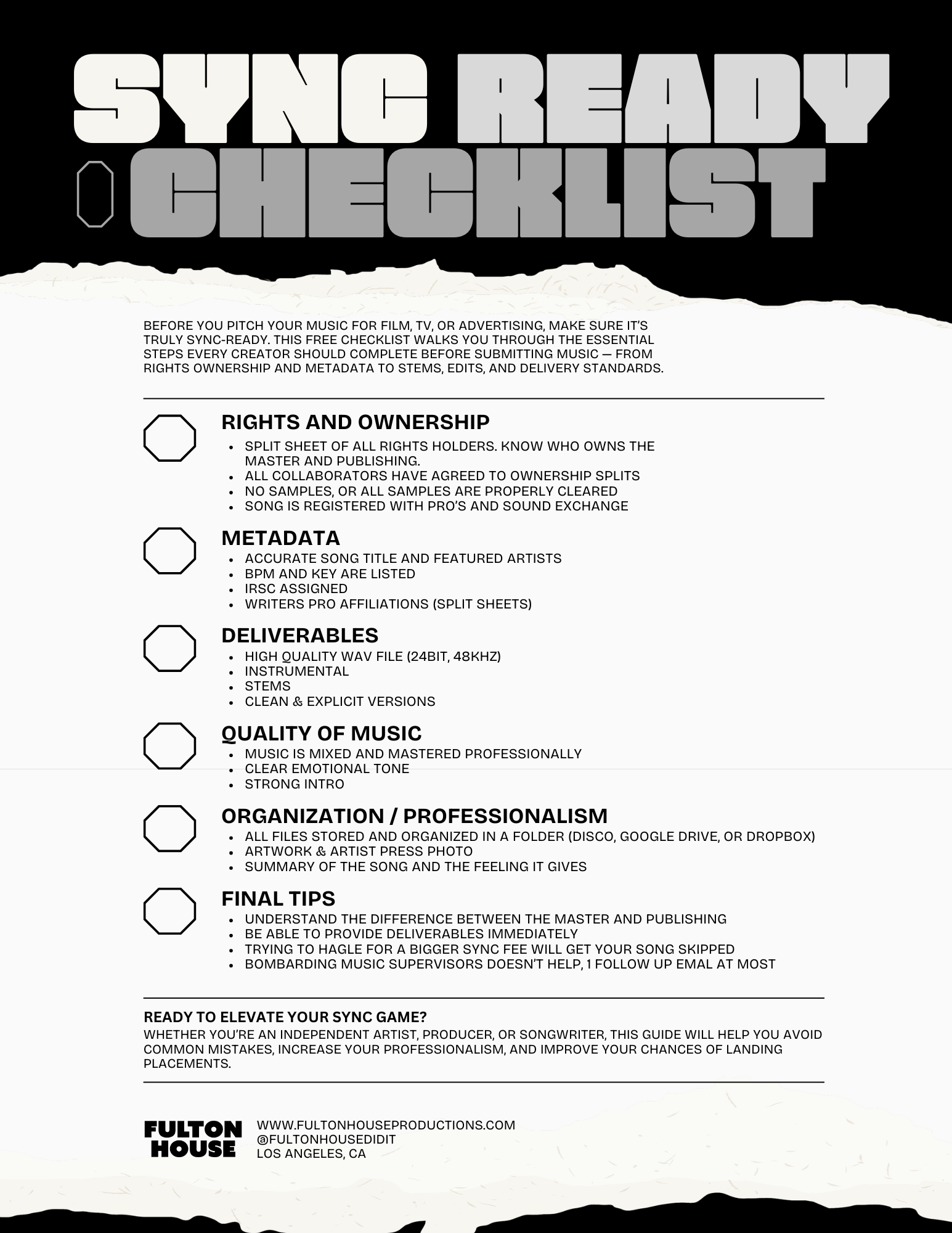 Practical tools and resources to help you understand, prepare, and position your music for sync. Built to give creators the clarity and structure needed to meet industry standards.